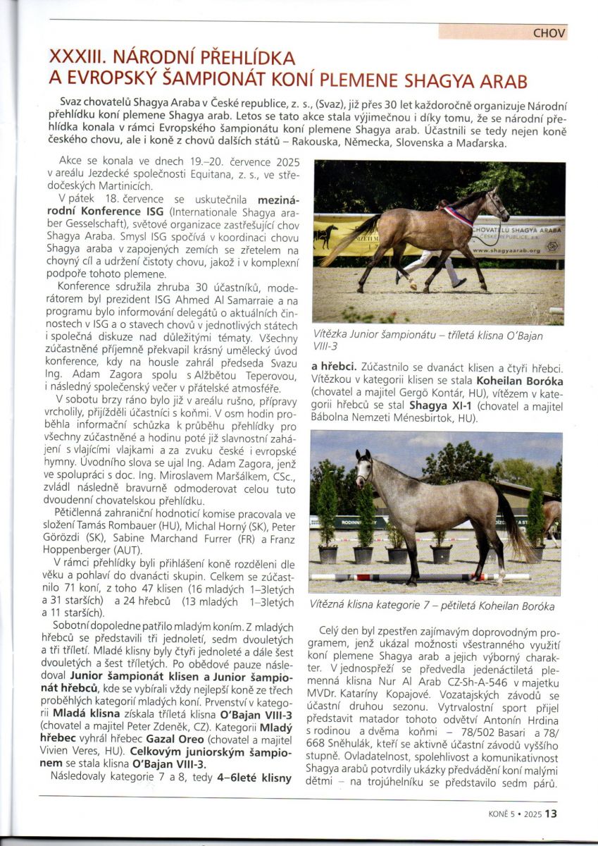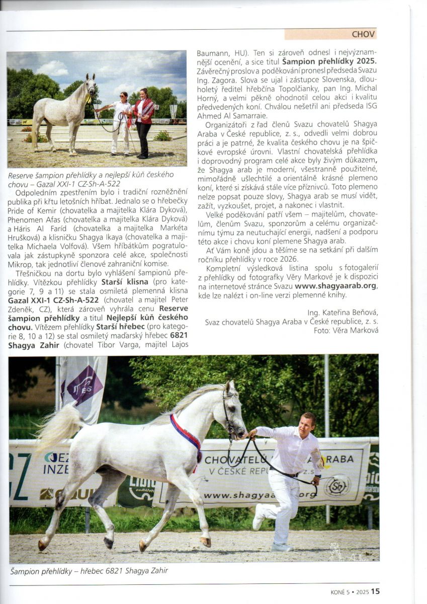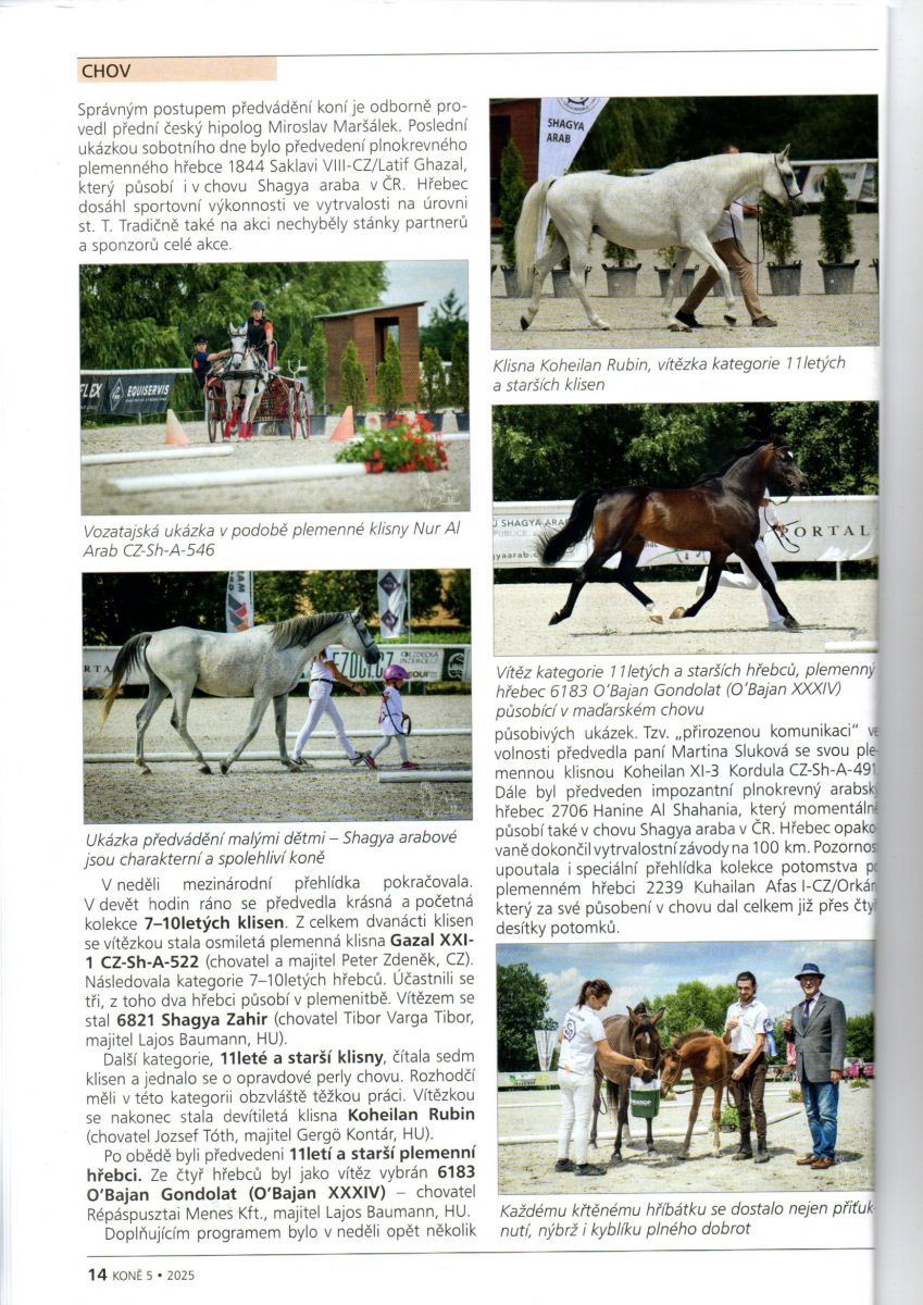 Článek o letošní XXXIII. Národní přehlídce koní plemene Shagya arab s mezinárodní účastí a Evropském šampionátu napsala Ing. Kateřina Beňová a byl publikován v Časopisu Koně 5/2025 v rubrice - Chov (str. 13-15) a byl doplněn vybranými fotografiemi od Věry Markové.