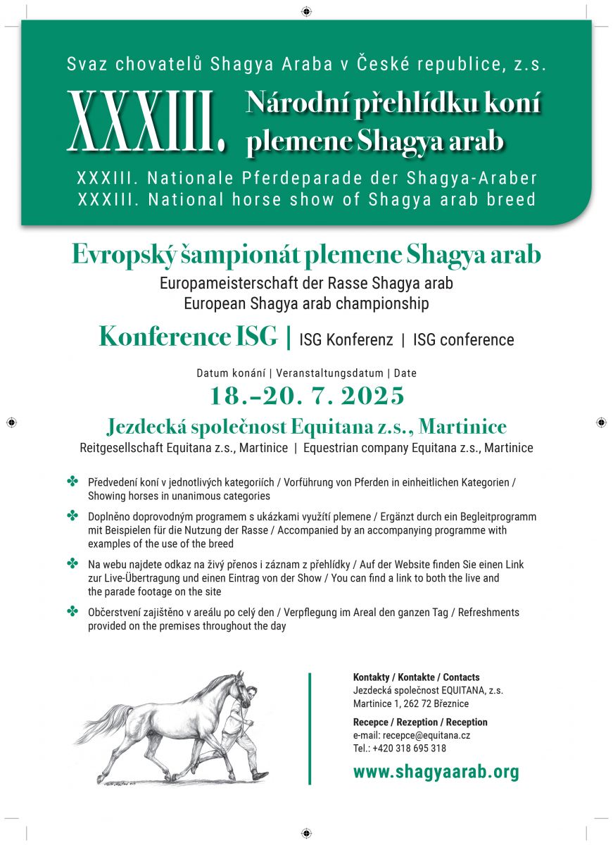 ROZPIS XXXIII. Národní přehlídka koní plemene Shagya arab s mezinárodní účastí - Evropský šampionát plemene Shagya arab a Konference ISG 18.-20.7.2025